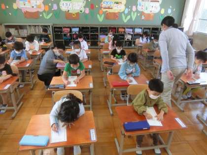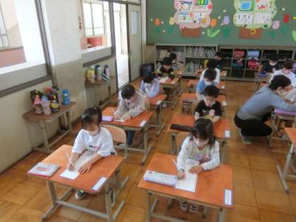 また,そのあとは,1年生になってはじめての自分の名前書きをしました。ゆっくり丁寧に書く姿が印象的でした。