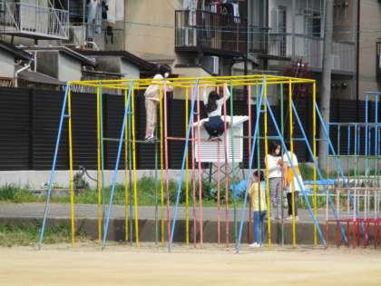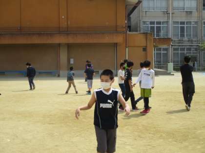 グラウンドでボールや遊具を使って遊んでいる様子です。