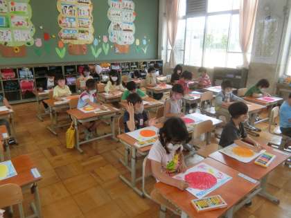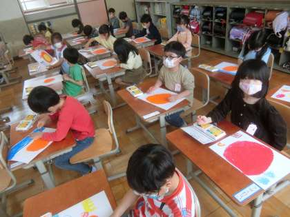 にこにこのおひさまの絵をかきました。それぞれの思う色で,おひさまの絵を楽しくかきました。