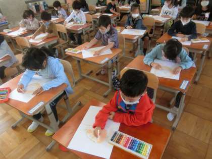 じぶんの顔をかきました。黄土色で,輪郭を描いた後,色をぬりました。お気に入りの服も着せました。
