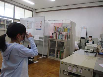視力検査をしました。前の人のすることを見て,上手に検査を受けられました。1年生のときより見えにくくなっているようです。引き続き,姿勢に気をつけて学習していきましょう。