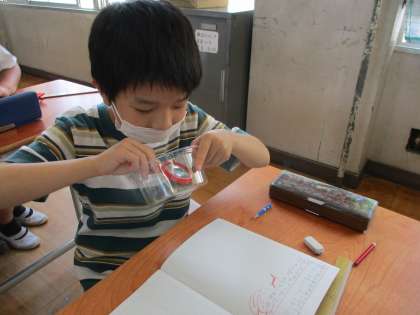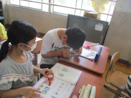 虫めがねを使って,チョウの卵を観察しています。