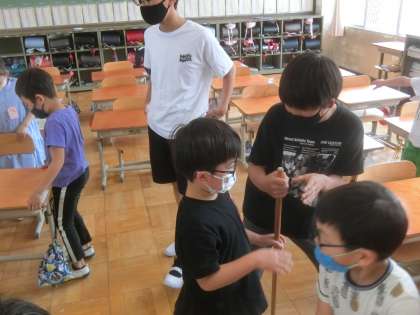 6年生に教えてもらいながら,自分たちでそうじをしました。ほうきの扱いが,難しいようで苦戦しました。6年生は根気強く,教えてくれています。