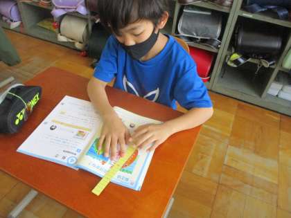 今日から「ながさ」の学習を始めました。うさぎとりすが釣った魚は,どちらの方が長いのかを紙ものさしを使って測りました。ものさしを線に添わせて端を合わせて丁寧に目盛りを数えていました。