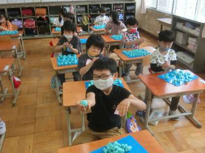 「ひもひもねんど」の学習がはじまりました。新しい粘土で,とても堅かったのですが,ちぎったり,ひねったりするうちに思い通りの形になり,とてもうれしそうでした。
