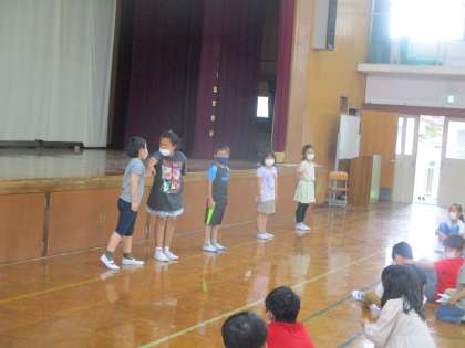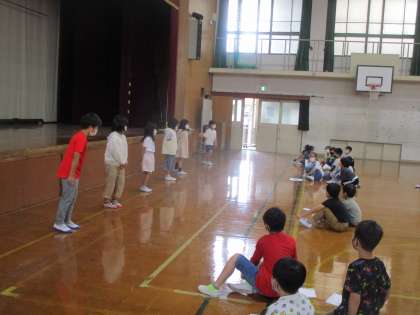 学校探検に行くためのグループの顔合わせの会「どうぞよろしく会」をしました。司会は,2年生がしました。