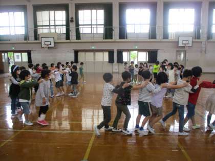 「どうぞよろしく会」の最後には,じゃんけん列車をして遊びました。最後には,長い列車になって楽しい時間を過ごすことができました。
