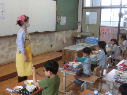 今日の給食時間は,栄養指導がありました。食事の時のマナーや栄養について指導してもらいました。