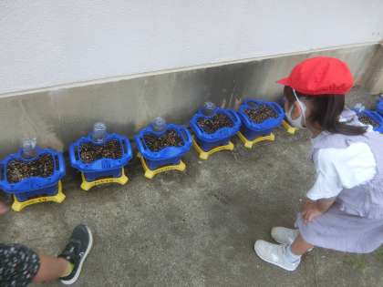 休み時間に何度も見に行っていたあさがおの芽がでました。まだ,5ミリメートルほどの小さな芽ですが,大喜びの子どもたちでした。休み時間のたびに何度も見に行っていました。