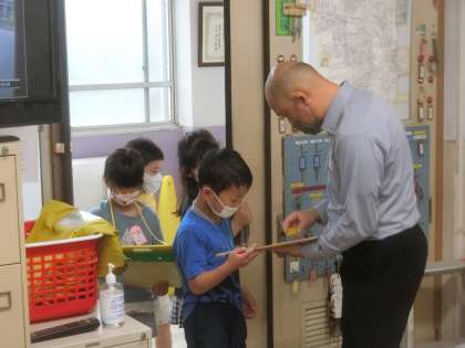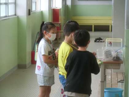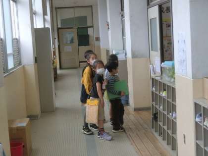 2年生が学校たんけんに連れて行ってくれました。2年生が教室紹介の看板を作ったり,道順を考えてくれたりと,工夫を凝らして準備してくれました。1年生は,学校のことがよくわかるようにと,しっかり見ていました。とても楽しかったとかえって来ました。