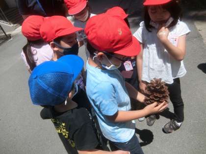 ミカンの木や松の木の観察もしました。みかんの木のはっぱは,触るとみかんのにおいがして,おどろいていました。また,松の木からは大きなまつぼっくりが見つかって,みんなで順番に触って楽しみました。