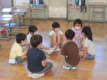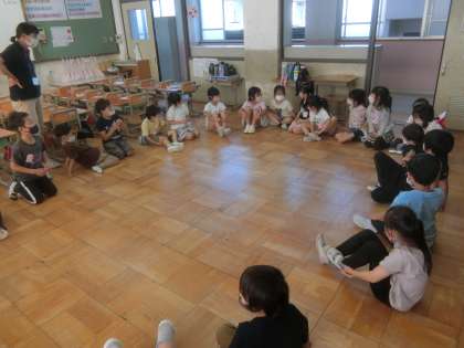 音楽の時間はリズム打ちを楽しみました。「タン・タン・タン・うん」のリズムに合わせて,友だちの名前を呼びました。また,呼ばれた人は,リズムに合わせて「は・あ・い」と返事をしました。