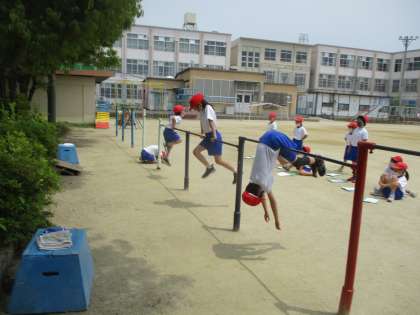 先週からてつぼうあそびをしています。自分のできる技が決められた時間に何回できるかや,何秒耐えられるかに挑戦しています。