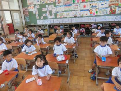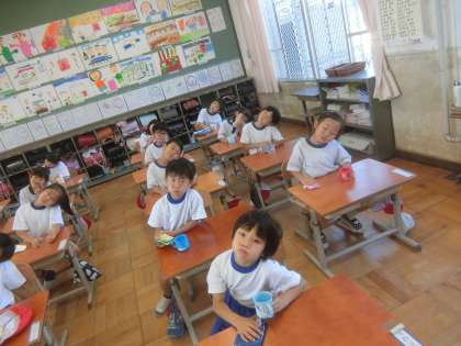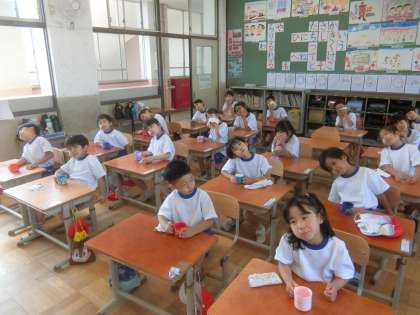 1年生も今日からフッ化物洗口がはじまりました。今日はお水で練習です。右・左と顔を傾けながら,取りくみました。こぼしてしまったり,間違えて飲み込んでしまう子は一人もいませんでした。来週ももう一度,お水で練習します。