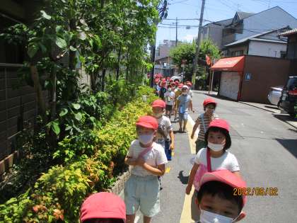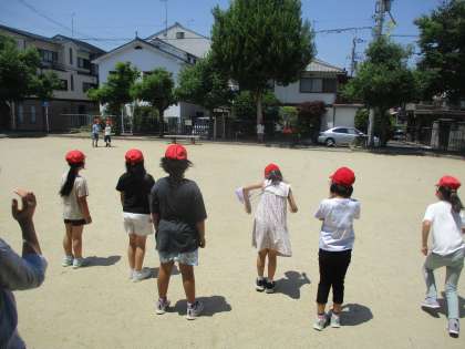 校区探検へ行きました。とても暑い日になりました。水分補給を何度もしながら校区を周りました。途中,星池公園により,公園遊びを楽しみました。