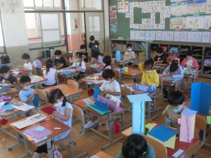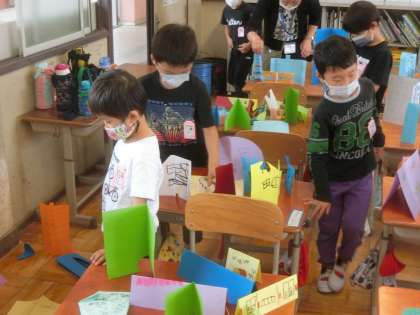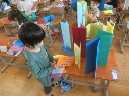 「おってたてたら」の作品が完成しました。お店屋さんや,電車が走る街並み,マンションなど,さまざまなテーマで作品をつくりました。そして,出来上がった作品は教室内にかざり,みんなで見合いました。