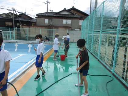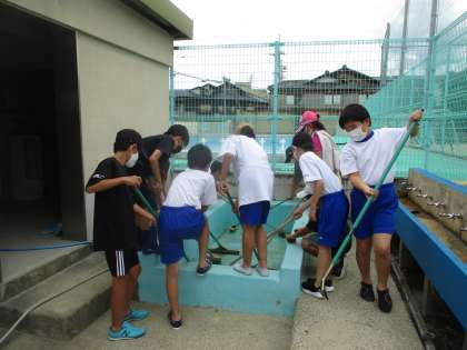水泳学習に向けてプール清掃を行いました。水に濡れながらもごしごし力強くこすってきれいにしてくれました。来週より水泳学習もスタートします。楽しみですね。