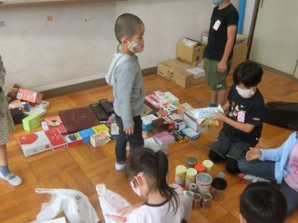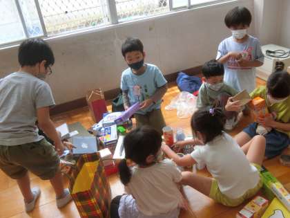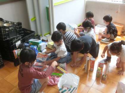 たくさんの箱を,形ごとに仲間分けしました。細長い四角や,さいころみたいな四角,細長い丸,など呼び方を工夫して声を掛け合いました。