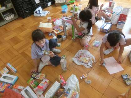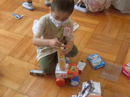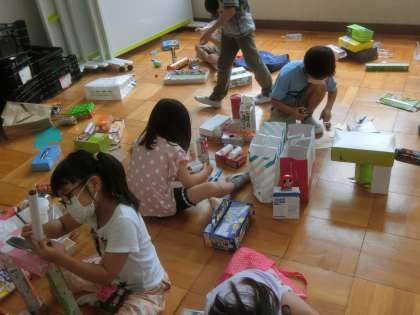 箱を使って,思い思いの作品を作りました。テーマを決めると,懸命に作っていました。イメージにぴったりの箱を探しながら,取りくみました。