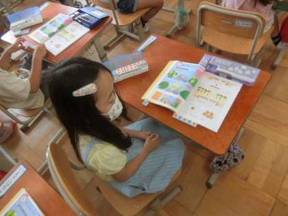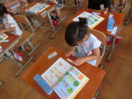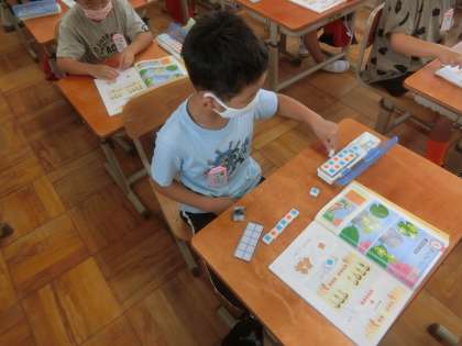 今日から「たしざん(1)」の学習がはじまりました。計算問題を早くやってみたいと思っていた1年生です。嬉しくて仕方ない様子でブロックを動かしていました。