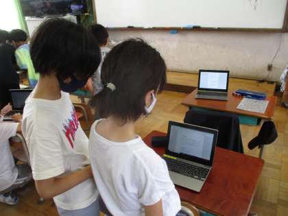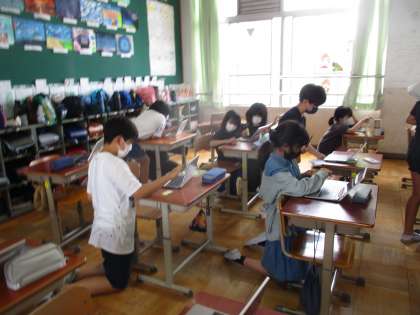 国語の学習で「みんなが過ごしやすい町へ」という学習をしています。身の回りには,みんなが過ごしやすい町になるような工夫がたくさんあります。そんな工夫を知らべてまとめました。タブレットを使って調べたり,読みあってアドバイスをしあったりしながらよりよい文章に仕上げていきます。