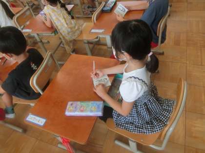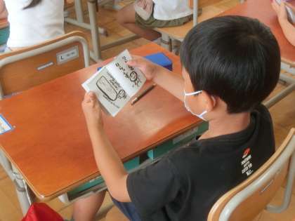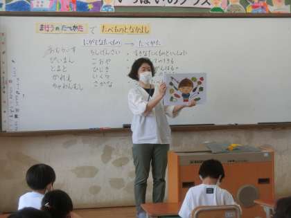 今日は栄養教諭による,食育指導がありました。食事をする時に,苦手な食べ物があったら,どうしたらよいか考えました。紙芝居の中にでてきた,「まほうのたべかた」の冊子を一人ずつもらい,大喜びでした。