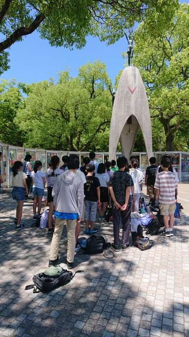 平和記念公園に到着しました。原爆の子の像の前で折鶴を捧げました。