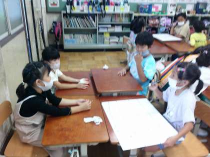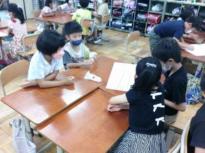 「かさ」の学習です。やかん、なべ、たらいにどのくらい水が入るのかを班で予想しました。最初にやかんに入る水のかさを確かめましたが、思ったよりもたくさん入ることにびっくりしていました。最後にたらいに水を入れましたが、1Lますに入れた水が何杯も何杯も入るので、目を丸くしていました。なんと20Lも入りました。さすがにそんなに入るとはだれも予想していませんでした。