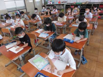 また,不審者が入った時には秘密の言葉の放送が入ることを話すと,自主的にメモをとって聞いていました。今日の1時間で,安全に避難をすることについて学んだこととおもいます。