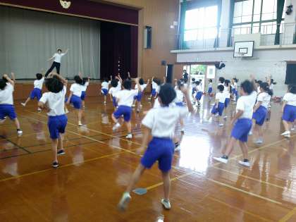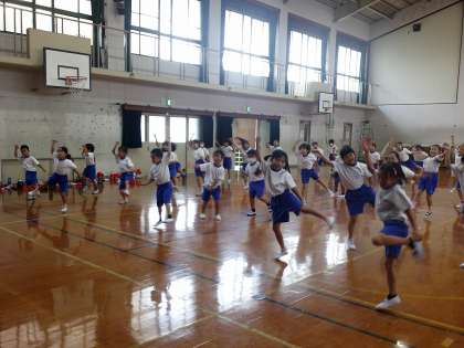 運動会にむけて、今日から1、2年生合同で練習を始めました。今日は、体育館でダンスの振り付けを覚えました。暑いので、水分をしっかりととりながら取り組みました。先生のお手本を見て、しっかりと踊っています。今日は、途中までの振り付けを覚えましたが、「もっと踊りたい!!」とやる気いっぱいです。