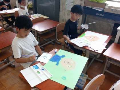 先週おじいちゃん、おばあちゃんの絵を描きました。その絵の周りに絵の具で色付けしました。水をたっぷり混ぜて描いた水玉は、シャボン玉のようです。