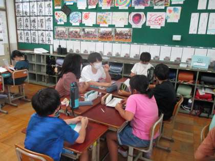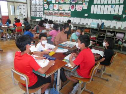 国語の学習で対話の練習を行っています。ペットとして飼うなら犬がいいか猫がいいかを、立場を明確にして話し合います。どのグループも盛り上がっていました。