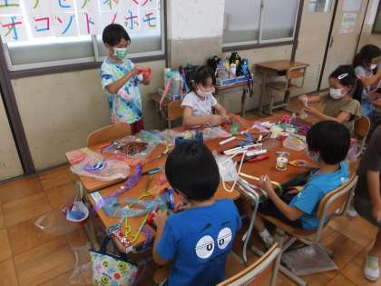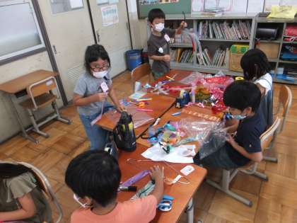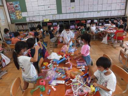 色とりどりのテープを使って,カラフルな飾りができました。ハンガーにテープを結びつけるのが,お気に入りの子が多かったように思います。