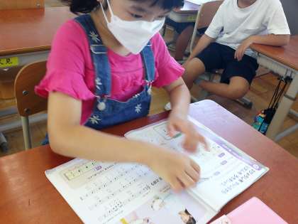 虫の鳴き声クイズの後、『虫のこえ』を歌いました。虫の鳴き声をリズムに合うように歌うのが難しいようです。その後、新しく「四分音符」「四分休符」の名前や書き方を学習しました。