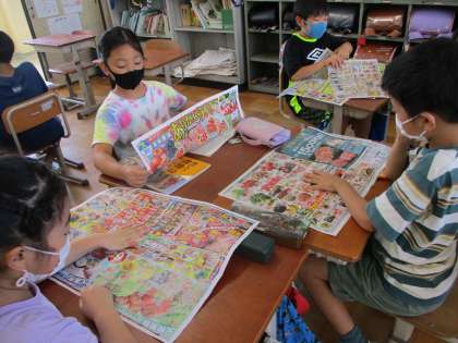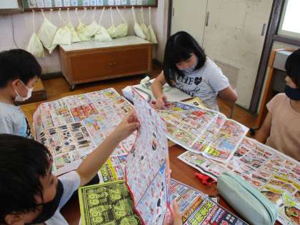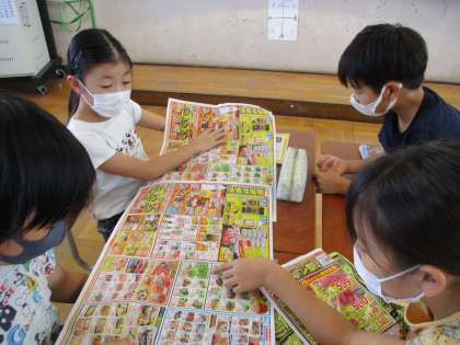 今日は、それぞれが持ってきたスーパーマーケットのチラシを見ながらスーパーマーケットの工夫を調べました。