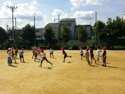 今日は、先週よりも暑い日でしたが、元気に運動場で遊んでいました。おもに1、2年生がいっしょになってドッジボールをしていました。2年生は受け取ったボールを