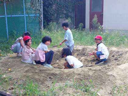 また砂場で水を使って仲良く水たまりを作っていました。お風呂だそうですが、きれいな(?)どろ水でした。