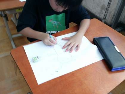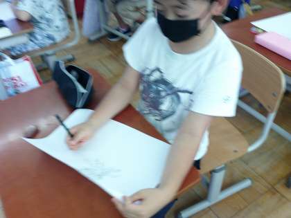 お話から想像したことを絵にする学習を始めました。最初に、自分の思う宇宙人の絵を描きました。描いた後、みんなの絵を見合いっこしました。