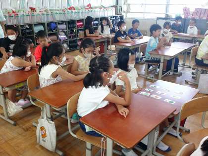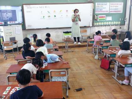 2学期初めてオグアラ先生の英語の学習がありました。2学期の学習は、「サラダで元気」です。学習の最後に、自分の特性サラダをカードを使って作ります。今日の学習では、「野菜の名前を聞こう」をめあてにカードゲームをしました。聞きなれない野菜の名前もあって、今日は覚えるのが大変だったようです。