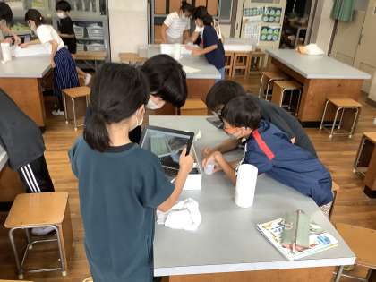 5年生では今、流れる水のはたらきと土地の変化について学習をしています。実際に川を砂で作ってみて水を流し、様子の変化を観察しています。タブレットで様子を記録する姿も見られ、意欲的に活動しています。