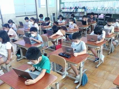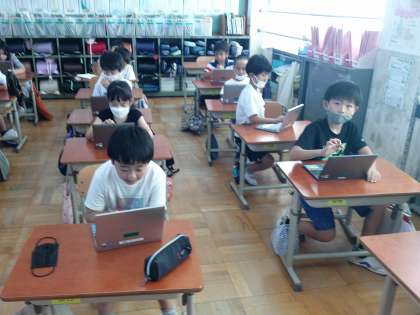 5時間目にも、タブレットを使って学習をしました。初めて文字を入力して調べる学習をしました。学校のホームページを検索して、自分や友達が映っている写真を見つけて喜んでいました。