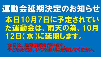 本日10月7日に予定されていた運動会は、雨天の為、10月12日(水)に延期します。