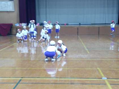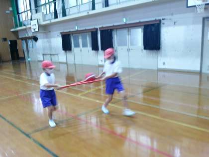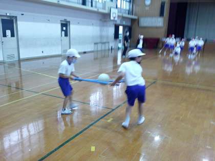 体育館で赤白グループに分かれてリレーをしました。棒でボールを挟んでのリレーです。二人で息を合わせてボールを落とさないようにしていました。抜きつ抜かれつの接戦でとても盛り上がりました。
