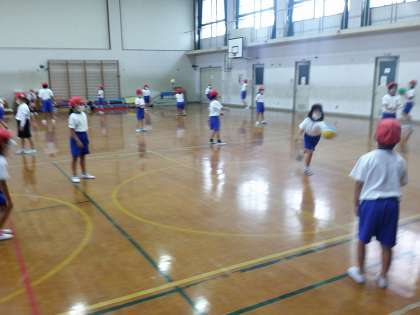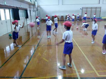 今日は、雨降りのため予定していた遊具あそびではなく、次の学習のパスゲームのためのパス練習をしました。ボールを受ける相手のことを考えてふんわりとパスをしている様子がたくさん見られ成長を感じました。2年生になったので、両手で胸の前でボールをもって押し出すようにパスをする方法や、片手でバウンドさせたボールをパスする方法も練習をしました。