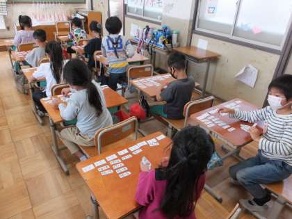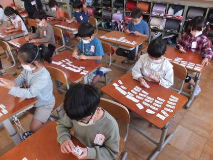 たしざん(2)の計算カードを答えの数ごとに並べました。きれいな階段のような形になり,おどろいていました。