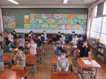 久しぶりにALTとの学習でした。数の数え方や体の部分の言い方を学びました。今日学習したことを生かして手遊びもしました。学習したことを生かした手遊びで,元気よく歌いながら取り組みました。