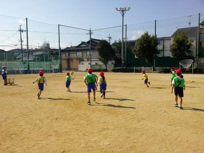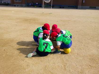 パスゲームに取り組んでいます。今回は、はじめにチームの時間を取り、作戦を話し合ったり、チームで練習する時間を取りました。その後のゲームでは、パスを素早くできるチームが増えていました。