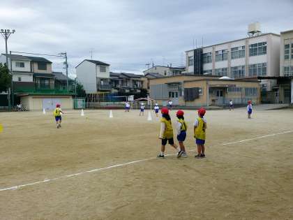 「なげあそび」をしました。距離をあらわすコーンに向かってソフトボールを投げます。グループの友だちと投げ方を見合いっこして教え合いをしました。