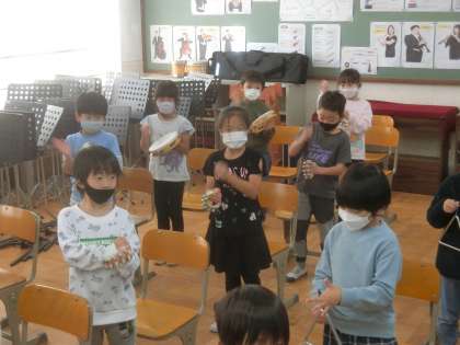 はじめての音楽室での学習でした。すず・タンブリン・ウッドブロック・トライアングルを使ってリズム遊びをしました。リズムに合わせてみんなで演奏を楽しみました。