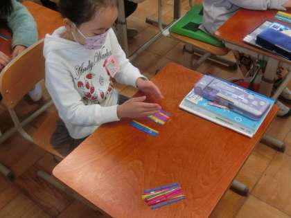 今日から「大きな数」の学習がはじまりました。今日は,たくさんの数え棒を10のまとまりごとに分けました。10のまとまりをつくると,大きな数でも数えやすいことに気が付きました。
